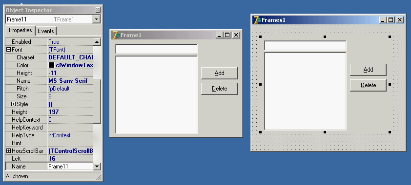 Figure 1.8: The Frames1 example demon-strates the use of frames. The frame (on the left) and its instance inside a form (on the right) are kept in synch. Like forms, frames define classes, so they fit within the VCL object-oriented model much more easily than component templates. Chapter 8, "The Architecture of Delphi Applications," provides an in-depth look at VCL and includes a more detailed description of frames. As you might imagine from this short introduction, frames are a powerful technique. |