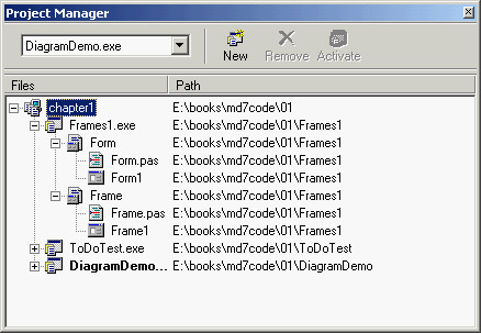 Managing ProjectsDelphi's multitarget Project Manager (View ® Project Manager) works on a project group, which can have one or more projects under it. For example, a project group can include a DLL and an executable file, or multiple executable files. All open packages will show up as projects in the Project Manager view, even if they haven't been added to the project group. In Figure 1.9, you can see the Project Manager with a simple project group, including all the examples of the current chapter. As you can see, the Project Manager is based on a tree view, which shows the hierarchical structure of the project group, the projects, and all the forms and units that make up each project. You can use the simple toolbar and the more complex shortcut menus of the Project Manager to operate on the projects in the group. The shortcut menu is context-sensitive; its options depend on the selected item. There are menu items to add a new or existing project to a project group, to compile or build a specific project, and to open a unit.