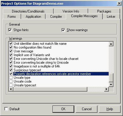 The Compile command can be used only when you have loaded a project in the editor. If no project is active and you load a Pascal source file, you cannot compile it. However, if you load the source file as if it were a project, that will do the trick and you'll be able to compile the file. To do this, simply select the Open Project toolbar button and load a PAS file. Now you can check its syntax or compile it, building a DCU. I've mentioned before that Delphi allows you to use run-time packages, which affect the distribution of the program more than the compilation process. Delphi packages are dynamic link libraries (DLLs) containing Delphi components. By using packages, you can make an executable file much smaller. However, the program won't run unless the proper DLLs (such as vcl70.bpl, which is quite large) are available on the computer where you want to run the program. If you add the size of this dynamic library to that of the small executable file, the total amount of disk space required by the apparently smaller program built with run-time packages is much larger than the space required by the apparently bigger stand-alone executable file. Of course, if you have multiple applications on a single system, you'll end up saving a lot, both in disk space and memory consumption at run time. The use of packages is often but not always recommended. I'll discuss all the implications of packages in detail in Chapter 10. In both cases, Delphi executables are extremely fast to compile, and the speed of the resulting application is comparable to that of a C or C++ program. Delphi compiled code runs at least five times faster than the equivalent code in interpreted or "semicompiled" tools. Compiler Message Helpers and WarningsAs I mentioned at the beginning of this chapter (in the section "Extended Compiler Messages and Search Results in Delphi 7"), in addition to the classic compiler messages, Delphi 7 provides a new window with additional information about some error messages. This window is activated using the View ® Additional Message Info menu command. It displays information stored in a local file, which can be updated by downloading a new version from Borland's website. Another change in Delphi 7 relates to the increased control you have over compiler warnings. The Project Options dialog box now includes a Compiler Messages page where you can choose many individual warnings. This feature was probably introduced due to the fact that Delphi 7 has a new set of warnings related to compatibility with the future Delphi for .NET tool. These warnings are quite extensive, and I've disabled them as shown in Figure 1.10. You can also enable or disable some of these warnings using compiler options like these: {$Warn UNSAFE_CODE OFF}