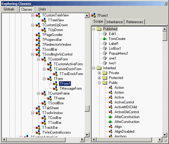 In general, it is better to keep these settings outside the source code of the program—something Delphi 7 finally allows you to do. Exploring a Project's ClassesDelphi has always included a tool to browse the symbols of a compiled project, although this tool's name has changed many times (from Object Browser to Project Explorer and now to Project Browser). In Delphi 7, you activate the Project Browser window using the View ® Browser menu command, which displays the window shown in Figure 1.11. The browser allows you to see the hierarchical structure of the project's classes and to look for its symbols and the source-code lines where they are referenced. Unlike the Code Explorer, the Project Browser is updated only as you recompile the project. This browser allows you to list classes, units, and globals, and lets you choose whether to look only for symbols defined within your project or for those from both your project and VCL. You can change the settings of the Project Browser and those of the Code Explorer in the Explorer page of the Environment Options or by selecting the Properties command in the shortcut menu of the Project Explorer. Some of the categories you see in this window are specific to the Project Browser; others relate to both tools. |
