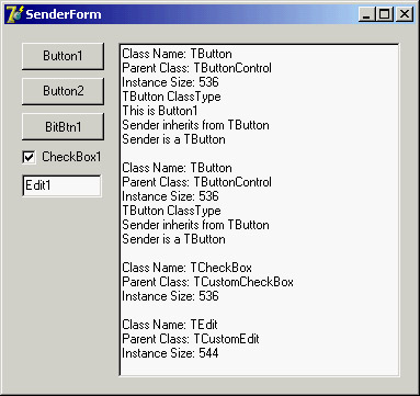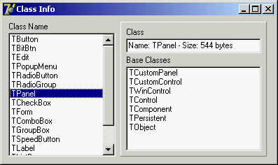 These methods of TObject are available for objects of every class, because TObject is the common ancestor class of every class. Here is how you can use these methods to access class information: procedure TSenderForm.ShowSender(Sender: TObject); begin Memo1.Lines.Add ('Class Name: ' + Sender.ClassName); if Sender.ClassParent <> nil then Memo1.Lines.Add ('Parent Class: ' + Sender.ClassParent.ClassName); Memo1.Lines.Add ('Instance Size: ' + IntToStr (Sender.InstanceSize)); end; The code checks to see whether the ClassParent is nil, in case you are using an instance of the TObject type, which has no base type. This ShowSender method is part of the IfSender example. The method is connected with the OnClick event of several controls: three buttons, a check box, and an edit box. When you click each control, the ShowSender method is invoked with the corresponding control as sender (more on events in Chapter 4). One of the buttons is a Bitmap button, an object of a TButton subclass. You can see an example of the output of this program at run time in Figure 3.7. You can use other methods to perform tests. For example, you can check whether the Sender object is of a specific type with the following code: if Sender.ClassType = TButton then ... You can also check whether the Sender parameter corresponds to a given object, with this test: if Sender = Button1 then... Instead of checking for a particular class or object, you'll generally need to test the type compatibility of an object with a given class; that is, you'll need to check whether the class of the object is a given class or one of its subclasses. Doing so lets you know whether you can operate on the object with the methods defined for the class. This test can be accomplished using the InheritsFrom method, which is also called when you use the is operator. The following two tests are equivalent: if Sender.InheritsFrom (TButton) then ... if Sender is TButton then ... Showing Class InformationI've extended the IfSender example to show a complete list of base classes of a given object or class. Once you have a class reference you can add all of its base classes to the ListParent list box with the following code: with ListParent.Items do begin Clear; while MyClass.ClassParent <> nil do begin MyClass := MyClass.ClassParent; Add (MyClass.ClassName); end; end; You'll notice that I use a class reference at the heart of the while loop, which tests for the absence of a parent class (so that the current class is TObject). Alternatively, I could have written the while statement in either of the following ways: while not MyClass.ClassNameIs ('TObject') do... while MyClass <> TObject do... The code in the with statement referring to the ListParent list box is part of the ClassInfo example, which displays the list of parent classes and some other information about a few components of the VCL (basically those on the Standard page of the Component Palette). These components are manually added to a dynamic array holding classes and declared as private ClassArray: array of TClass; When the program starts, the array is used to show all the class names in a list box. Selecting an item from the list box triggers the visual presentation of its details and its base classes, as you can see in the program output in Figure 3.8.