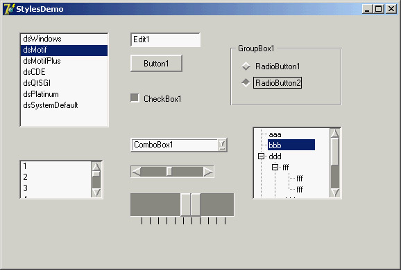 Because this technique is embedded in Qt, it is also available on the Windows version of the library; CLX makes it available to Delphi developers, so that an application can have a Motif look-and-feel on a Microsoft operating system. The CLX Application global object has a Style property you can use to set a custom style or a default one, indicated by the DefaultStyle subproperty. For example, you can select a Motif look-and-feel with this code: Application.Style.DefaultStyle := dsMotif; In the StylesDemo program, I've added, among various sample controls, a list box with the names of the default styles, as indicated in the TDefaultStyle enumeration, and this code for its OnDblClick event: procedure TForm1.ListBox1DblClick(Sender: TObject); begin Application.Style.DefaultStyle := TDefaultStyle (ListBox1.ItemIndex); end; The effect is that, by double-clicking the list box, you can change the current application style and immediately see its effect on screen, as demonstrated in Figure 6.7. Windows XP ThemesWith the release of Windows XP, Microsoft has introduced a new, separate version of the common controls library. The old library is still available for compatibility reasons, so that a program running on XP can choose which of the two libraries it wants to use. The new common controls library's main difference is that is doesn't has a fixed rendering engine, but relies on the XP theme engine and delegates the user interface of the controls to the current theme. In Delphi 7, the VCL fully supports themes, due to a lot of internal code and to the themes management library originally developed by Mike Lischke. Some of these new rendering features are used by the visual controls of the Action Manager architecture, independently of the operating system you are running on. However, full theme support is available only on an operating system that has this feature—at the moment, Windows XP. Even on XP, Delphi applications use the traditional approach by default. To support XP themes, you must include a manifest file in the program. You can do so multiple ways: