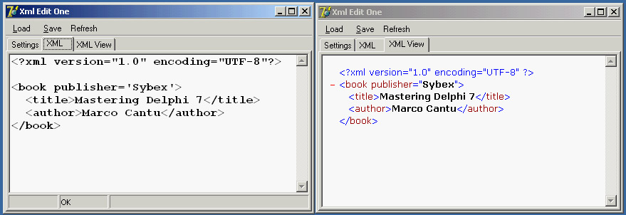 Introducing XMLExtensible Markup Language (XML) is a simplified version of SGML and is getting a lot of attention in the IT world. XML is a markup language, meaning it uses symbols to describe its own content—in this case, tags consisting of specially defined text enclosed in angle brackets. It is extensible because it allows for free markers (in contrast, for example, to HTML, which has predefined markers). The XML language is a standard promoted by the World Wide Web Consortium (W3C). The XML Recommendation is at www.w3.org/TR/REC-xml. XML has been touted as the ASCII of the year 2000, to indicate a simple and widespread technology and also to indicate that an XML document is a plain-text file (optionally with Unicode characters instead of plain ASCII text). The important characteristic of XML is that it is descriptive, because every tag has an almost human-readable name. Here is an example, in case you've never seen an XML document: <book> <title>Mastering Delphi 7</title> <author>Cantu</author> <publisher>Sybex</publisher> </book> XML has a few disadvantages I want to underline from the beginning. The biggest is that without a formal description, a document is worth little. If you want to exchange documents with another company, you must agree on what each tag means and also on the semantic meaning of the content. (For example, when you have a quantity, you have to agree on the measurement system or include it in the document.) Another disadvantage is that XML documents are much larger than other formats; using strings for numbers, for example, is far from efficient, and the repeated opening and closing tags eat up a lot of space. The good news is that XML compresses well, for the same reason. Core XML SyntaxA few technical elements of XML are worth knowing before we discuss its usage in Delphi. Here is a short summary of the key elements of the XML syntax: