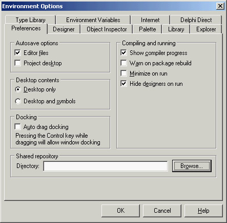 Environment OptionsQuite a few recent updates relate to the commonly used Environment Options dialog box. The pages of this dialog box were rearranged in Delphi 6, moving the Form Designer options from the Preferences page to the new Designer page. In Delphi 6 there were also a few new options and pages: