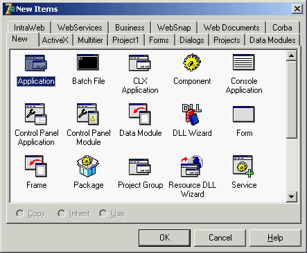 Only one form and only one project in the Object Repository can have each of these three settings marked with a special symbol placed over its icon. If no project is selected as New Project, Delphi creates a default project based on the form marked as Main Form. If no form is marked as the main form, Delphi creates a default project with an empty form. When you work on the Object Repository, you work with forms and modules saved in the OBJREPOS subdirectory of the Delphi main directory. At the same time, if you use a form or any other object directly without copying it, then you end up having some of your project files in this directory. It is important to realize how the Repository works, because if you want to modify a project or an object saved in the Repository, the best approach is to operate on the original files without copying data back and forth to the Repository. |