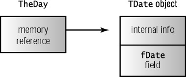 Delphi's Object Reference ModelIn some OOP languages, declaring a variable of a class type creates an instance of that class. Delphi, instead, is based on an object reference model. The idea is that a variable of a class type, such as the TheDay variable in the preceding ViewDate example, does not hold the value of the object. Rather, it contains a reference, or a pointer, to indicate the memory location where the object has been stored. You can see this structure depicted in Figure 2.4.