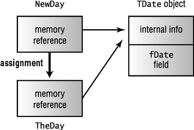 Figure 2.5: A representation of the operation of assigning an object reference to another object. This is different from copying the actual content of an object to another. This specific issue can be solved by freeing the old object, as in the following code (which is also simplified, without the use of an explicit variable for the newly created object): procedure TDateForm.BtnTodayClick(Sender: TObject); begin TheDay.Free; TheDay := TDate.Create; The important thing to keep in mind is that, when you assign an object to another object, Delphi copies the reference to the object in memory to the new object reference. You should not consider this a negative: In many cases, being able to define a variable referring to an existing object can be a plus. For example, you can store the object returned by accessing a property and use it in subsequent statements, as this code snippet indicates: var ADay: TDate; begin ADay := UserInformation.GetBirthDate; // use a ADay The same thing happens if you pass an object as a parameter to a function: You don't create a new object, but you refer to the same one in two different places in the code. For example, by writing this procedure and calling it as follows, you'll modify the Caption property of the Button1 object, not of a copy of its data in memory (which would be totally useless): procedure CaptionPlus (Button: TButton); begin Button.Caption := Button.Caption + '+'; end; // call... CaptionPlus (Button1) This means that the object is being passed by reference without the use of the var keyword and without any other obvious indication of the pass-by-reference semantic, which also confuses newcomers. What if you really want to change the data inside an existing object, so that it matches the data of another object? You have to copy each field of the object, which is possible only if they are all public, or provide a specific method to copy the internal data. Some classes of the VCL have an Assign method, which performs this copy operation. To be more precise, most of the VCL classes that inherit from TPersistent, but do not inherit from TComponent, have the Assign method. Other TComponent-derived classes have this method but raise an exception when it is called. In the DateCopy example, I've added an Assign method to the TDate class and called it from the Today button, with the following code: procedure TDate.Assign (Source: TDate); begin fDate := Source.fDate; end; procedure TDateForm.BtnTodayClick(Sender: TObject); var NewDay: TDate; begin NewDay := TDate.Create; TheDay.Assign(NewDay); LabelDate.Caption := TheDay.GetText; NewDay.Free; end; Objects and MemoryMemory management in Delphi is subject to three rules, at least if you allow the system to work in harmony without Access Violations and without consuming unneeded memory: