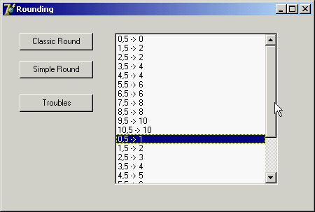 You can use RandomRange and RandomFrom instead of the traditional Random function to gain more control over the random values produced by the RTL. The first function returns a number within two extremes you specify, and the second selects a random value from an array of possible numbers you pass to it as a parameter. The InRange Boolean function can be used to check whether a number is within two other values. The EnsureRange function, on the other hand, forces the value to be within the specified range. The return value is the number itself or the lower limit or upper limit, in the event the number is out of range. Here is an example: // do something only if value is within min and max if InRange (value, min, max) then ... // make sure the value is between min and max value := EnsureRange (value, min, max); ... Another set of useful functions relates to comparisons. Floating-point numbers are fundamentally inexact; a floating-point number is an approximation of a theoretical real value. When you do mathematical operations on floating-point numbers, the inexactness of the original values accumulates in the results. Multiplying and dividing by the same number might not return exactly the original number but one that is very close to it. The SameValue function allows you to check whether two values are close enough in value to be considered equal. You can specify how close the two numbers should be or let Delphi compute a reasonable error range for the representation you are using. (This is why the function is overloaded.) Similarly, the IsZero function compares a number to zero, with the same "fuzzy logic." The CompareValue function uses the same rule for floating-point numbers but is available also for integers; it returns one of the three constants LessThanValue, EqualsValue, and GreaterThanValue (corresponding to –1, 0, and 1). Similarly, the new Sign function returns –1, 0, or 1 to indicate a negative value, zero, or a positive value. The DivMod function is equivalent to both the div and mod operations, returning the result of the integer division and the remainder (or modulus) at once. The RoundTo function allows you to specify the rounding digit—allowing, for example, rounding to the nearest thousand or to two decimals: RoundTo (123827, 3); // result is 124,000 RoundTo (12.3827, -2); // result is 12.38 There have also been some changes to the standard rounding operations provided by the Round function: You can now control how the FPU (the floating-point unit of the CPU) does the rounding by calling the SetRoundMode function. Other functions control the FPU precision mode and its exceptions. Rounding HeadachesDelphi's classic Round function and the newer RoundTo functions are mapped to the CPU/ FPU rounding algorithms. By default, Intel CPUs use banker's rounding, which is also the type of rounding typically found in spreadsheet applications. Banker's rounding is based on the assumption that when you're rounding numbers that lie exactly between two values (the .5 numbers), rounding them all up or all down will statistically increase or reduce the total amount (of money, in general). For this reason, the rule of banker's rounding indicates that .5 numbers should be rounded down or up depending on whether the number (without decimals) is odd or even. This way, the rounding will be balanced, at least statistically. You can see an example of the output of banker's rounding in Figure 3.1, which shows the output of the Rounding example I've built to demonstrate different types of rounding. The program also uses another type of rounding provided by the Math unit in the SimpleRoundTo function, which uses asymmetric arithmetic rounding. In this case, all .5 numbers are rounded to the upper value. However, as highlighted in the Rounding example, the function doesn't work as expected when rounding to a decimal digit (that is, when you pass a negative second parameter). In this case, due to the representation errors of floating-point numbers, the rounding trims the values; for example, it turns 1.15 into 1.1 instead of the expected 1.2. The solution is to multiply the value by ten before rounding, round it to zero decimal digits, and then divide it, as demonstrated in the sample program: SimpleRoundTo (d * 10, 0) / 10) The ConvUtils and StdConvs UnitsThe ConvUtils unit contains the core of the conversion engine introduced in Delphi 6. It uses the conversion constants defined by a second unit, StdConvs. I'll cover these two units later in this chapter and show how to extend them with new measurement units.