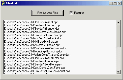 If the Recurse parameter is set, the AddFilesToList procedure gets a list of subfolders by examining the local files again, and then calls itself for each of the subfolders. The list of folders is placed in a string list object, with the following code: