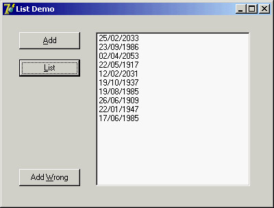 Name-Value Pairs (and Delphi 7 Extensions)The TStringList class has always had another nice feature: support for name-value pairs. If you add to a list a string like 'lastname=john', you can then search for the existence of the pair using the IndexOfName function or the Values array property. For example, you can retrieve the value 'john' by calling Values ['lastname']. You can use this feature to build much more complex data structures, such as dictionaries, and still benefit from the possibility of attaching an object to the string. This data structure maps directly to initialization files and other common formats. Delphi 7 further extends the possibilities of name-value pair support by allowing you to customize the separator, beyond the equal sign, using the new NameValueSeparator property. In addition, the new ValueFromIndex property gives you direct access to the value portion of a string at a given position; you no longer have to extract the name value manually from the complete string using a cumbersome (and extremely slow) expression: str := MyStringList.Values [MyStringList.Names [I]]; // old str := MyStringList.ValueFromIndex [I]; // new Using Lists of ObjectsI've written an example focusing on the use of the generic TList class. When you need a list of any kind of data, you can generally declare a TList object, fill it with the data, and then access the data while casting it to the proper type. The ListDemo example demonstrates this approach and also shows its pitfalls. The form has a private variable, holding a list of dates: private ListDate: TList; This list object is created when the form itself is created: procedure TForm1.FormCreate(Sender: TObject); begin Randomize; ListDate := TList.Create; end; A button on the form adds a random date to the list (of course, I've included in the project the unit containing the date component built in the previous chapter):