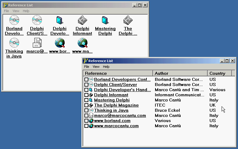 Figure 5.12: Different examples of the output of a ListView compo-nent in the RefList program, obtained by changing the ViewStyle property and adding the check boxes Another important feature, which is common in the detailed or report view of the control, lets a user sort the items on one of the columns. In the VCL, this technique requires three operations. First, you set the SortType property of the ListView to stBoth or stData. This way, the ListView will sort based not on the captions, but by calling the OnCompare event for each two items it has to sort. Second, because you want to sort on each of the columns of the detailed view, you also handle the OnColumnClick event (which takes place when the user clicks on the column titles in the detailed view, but only if the ShowColumnHeaders property is set to True). Each time a column is clicked, the program saves the number of that column in the form class's nSortCol private field: procedure TForm1.ListView1ColumnClick(Sender: TObject; Column: TListColumn); begin nSortCol := Column.Index; ListView1.AlphaSort; end; Then, in the third step, the sorting code uses either the caption or one of the subitems according to the current sort column: