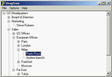 The LoadFromFile method loads the data in a string list and checks the level of each item by looking at the number of tab characters. (If you are curious, see the TTreeStrings.GetBufStart method, which you can find in the ComCtrls unit in the VCL source code included in Delphi.) The data I've prepared for the TreeView is the organizational chart of a multinational company, as you can see in Figure 5.13. Instead of expanding the node items one by one, you can also use the File ® Expand All menu of this program, which calls the FullExpand method of the TreeView control or executes the equivalent code (in this specific case of a tree with a root item): TreeView1.Items [0].Expand(True); Besides loading the data, the program saves the data when it terminates, making the changes persistent. It also has a few menu items to customize the font of the TreeView control and change some other simple settings. The specific feature I've implemented in this example is support for dragging items and entire subtrees. I've set the DragMode property of the component to dmAutomatic and written the event handlers for the OnDragOver and OnDragDrop events. In the first of the two handlers, the program makes sure the user is not trying to drag an item over a child item (which would be moved along with the item, leading to an infinite recursion):