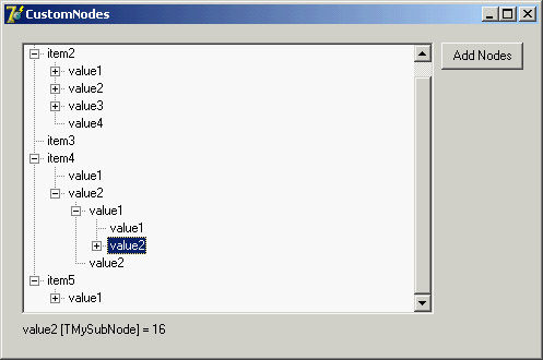 With these custom tree node classes available, the program creates a tree of items, using the first type for the first-level nodes and the second class for the other nodes. Because you have only one OnCreateNodeClass event handler, the program uses the class reference stored in a private field of the form (CurrentNodeClass of type TTreeNodeClass): procedure TForm1.TreeView1CreateNodeClass(Sender: TCustomTreeView; var NodeClass: TTreeNodeClass); begin NodeClass := CurrentNodeClass; end; The program sets this class reference before creating nodes of each type—for example, with code like the following: