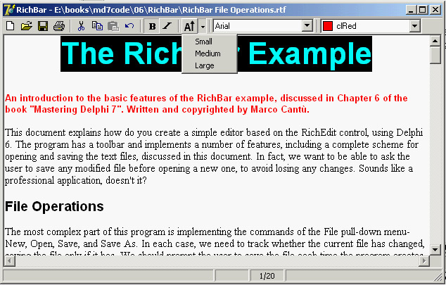 Again, the current status of the button is determined by the current selection, so you'll need to add the following line to the RichEditSelectionChange method: tbtnBold.Down := fsBold in RichEdit.SelAttributes.Style; A Menu and a Combo Box in a ToolbarBesides a series of buttons, the RichBar example has a drop-down menu and a couple of combo boxes, a feature shared by many common applications. The drop-down button allows selection of the font size, and the combo boxes allow rapid selection of the font family and the font color. This second combo is built using a ColorBox control. The Size button is connected to a PopupMenu component (called SizeMenu) using the DropdownMenu property. A user can click the button, firing its OnClick event as usual, or select the drop-down arrow, open the pop-up menu (see again Figure 6.5), and choose one of its options. This case has three possible font sizes, per the menu definition: