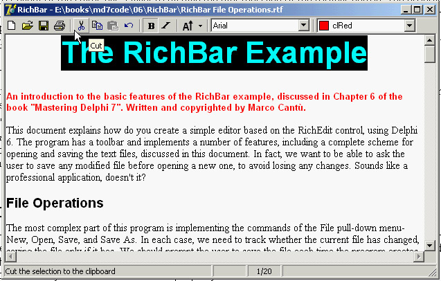 To create a graphic toolbar, you can add an ImageList component to the form, load some bitmaps into it, and then connect the ImageList with the Images property of the toolbar. By default, the images will be assigned to the buttons in the order they appear, but you can change this behavior quite easily by setting the ImageIndex property of each toolbar button. You can prepare further ImageLists for special button conditions and assign them to the DisabledImages and HotImages properties of the toolbar. The first group is used for the disabled buttons; the second is used for the button currently under the mouse. The RichBar ExampleAs an example of the use of a toolbar, I've built the RichBar application, which has a RichEdit component you can operate by using the toolbar. The program has buttons for loading and saving files, for copy and paste operations, and to change some of the attributes of the current font. I won't cover the many details of the RichEdit control's features, which I briefly discussed in a previous chapter, nor discuss the details of this application, which has quite a lot of code. All I'll do is focus on features specific to the ToolBar used by the example and visible in Figure 6.5. This toolbar has buttons, separators, and even a drop-down menu and two combo boxes (discussed in the next section). The various buttons implement features, including opening and saving text files—the program asks the user to save any modified file before opening a new one, to avoid losing any changes. The file-handling portion of the program is quite complex but it is worth exploring, because many file-based applications will use similar code. More details are available in the file RichBar File Operations.rtf with the source code for this example, a file you can open with the RichBar program itself. Besides file operations, the program supports copy and paste operations and font management. The copy and paste operations don't require an interaction with the VCL Clipboard object, because the component can handle them with simple commands like these: RichEdit.CutToClipboard; RichEdit.CopyToClipboard; RichEdit.PasteFromClipboard; RichEdit.Undo; It is a little more advanced to know when these operations (and the corresponding buttons) should be enabled. You can enable Copy and Cut buttons when some text is selected, in the OnSelectionChange event of the RichEdit control: procedure TFormRichNote.RichEditSelectionChange(Sender: TObject); begin tbtnCut.Enabled := RichEdit.SelLength > 0; tbtnCopy.Enabled := tbtnCut.Enabled; end; The Copy operation cannot be determined by an action of the user, because it depends on the content of the Clipboard, which is also influenced by other applications. One approach is to use a timer and check the Clipboard content from time to time. A better approach is to use the OnIdle event of the Application object (or the ApplicationEvents component). Because the RichEdit control supports multiple Clipboard formats, the code cannot simply look at those, but should ask the component itself, using a low-level feature not surfaced by the Delphi control: procedure TFormRichNote.ApplicationEvents1Idle(Sender: TObject; var Done: Boolean); begin // update toolbar buttons tbtnPaste.Enabled := RichEdit.Perform (em_CanPaste, 0, 0) <> 0; end; Basic font management is given by the Bold and Italic buttons, which have similar code. The Bold button toggles the relative attribute from the selected text (or changes the style at the current edit position):