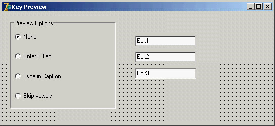 Direct Form InputHaving discussed some special capabilities of forms, I'll now move to a very important topic: user input in a form. If you decide to make limited use of components, you might write complex programs as well, receiving input from the mouse and the keyboard. In this chapter, I'll only introduce this topic. Supervising Keyboard InputGenerally, forms don't handle keyboard input directly. If a user has to type something, your form should include an edit component or one of the other input components. If you want to handle keyboard shortcuts, you can use those connected with menus (possibly using a hidden pop-up menu). At other times, however, you might want to handle keyboard input in particular ways for a specific purpose. In these cases, you can turn on the form's KeyPreview property. Then, even if you have some input controls, the form's OnKeyPress event will always be activated for any character-input operation (system and shortcut keys excluded). The keyboard input will then reach the destination component, unless you stop it in the form by setting the character value to zero (not the character 0, but the value 0 of the character set, a control character indicated as #0). The example I've built to demonstrate this approach, KPreview, has a form with no special properties (not even KeyPreview), a radio group with four options, and some edit boxes, as you can see in Figure 7.5. By default the program does nothing special, except when the various radio buttons are used to enable the key preview: procedure TForm1.RadioPreviewClick(Sender: TObject); begin KeyPreview := RadioPreview.ItemIndex <> 0; end; Now you'll begin receiving the OnKeyPress events, and you can do one of the three actions requested by the three special buttons in the radio group. The action depends on the value of the ItemIndex property of the radio group component. This is the reason the event handler is based on a case statement: