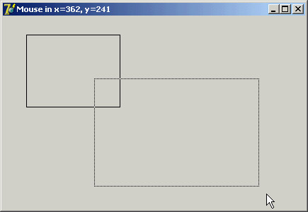 The final call, Invalidate, triggers a painting operation and executes the following OnPaint event handler: procedure TMouseForm.FormPaint(Sender: TObject); begin Canvas.Rectangle (fRect.Left, fRect.Top, fRect.Right, fRect.Bottom); end; This makes the output of the form persistent, even if you hide it behind another form. Figure 7.6 shows a previous version of the rectangle and a dragging operation in action. |