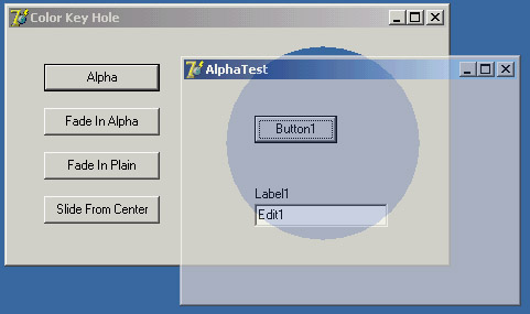 One of the recent Delphi features related to forms is support for new Windows APIs that affect the way forms are displayed (in Windows 2000/XP, but not available under Qt/CLX). Alpha blending allows you to merge the content of a form with what's behind it on the screen—functionality you'll rarely need, at least in a business application. The technique is more interesting when applied to bitmap (with the new AlphaBlend and AlphaDIBBlend API functions) than to a form. In any case, by setting the AlphaBlend property of a form to True and giving to the AlphaBlendValue property a value lower than 255, you'll be able to see in transparency what's behind the form. The lower the AlphaBlendValue, the more the form will fade. You can see an example of alpha blending in Figure 7.7, taken from the ColorKeyHole example.
