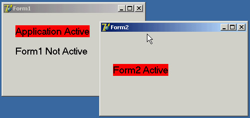 The GetWindowLong and SetWindowLong API functions access the system information related to the window. In this case, you use the gwl_Style parameter to read or write the styles of the window, which include its border, title, system menu, border icons, and so on. This code gets the current styles and adds (using an or statement) a standard border and a caption to the form. Of course, you generally won't need to implement something like this in your programs. But knowing the application object has a window connected to it is an important aspect of understanding the default structure of Delphi applications and being able to modify it when needed. Activating Applications and FormsTo show how the activation of forms and applications works, I've written a self-explanatory example called ActivApp. This example has two forms. Each form has a Label component (LabelForm) used to display the form's status. The program uses text and color to indicate this status information, as the handlers of the first form's OnActivate and OnDeactivate events demonstrate: procedure TForm1.FormActivate(Sender: TObject); begin LabelForm.Caption := 'Form2 Active'; LabelForm.Color := clRed; end; procedure TForm1.FormDeactivate(Sender: TObject); begin LabelForm.Caption := 'Form2 Not Active'; LabelForm.Color := clBtnFace; end; The second form has a similar label and similar code. The main form also displays the status of the entire application. It uses an ApplicationEvents component to handle the Application object's OnActivate and OnDeactivate events. These two event handlers are similar to the two listed previously; the only difference is that they modify the text and color of a second label on the form and that one of them makes a beep. If you run this program, you'll see whether this application is active and, if so, which of its forms is active. By looking at the output (see Figure 8.1) and listening for the beep, you can understand how Delphi triggers each of the activation events. Run the program and play with it for a while to understand how it works. Later, we'll get back to other events related to the activation of forms. Tracking Forms with the Screen ObjectWe have already explored some of the properties and events of the Application object. Other interesting global information about an application is available through the Screen object, whose base class is TScreen. This object holds information about the system display (the screen size and the screen fonts) and also about the current set of forms in a running application. For example, you can display the screen size and the list of fonts by writing: Label1.Caption := IntToStr (Screen.Width) + 'x' + IntToStr (Screen.Height); ListBox1.Items := Screen.Fonts; TScreen also reports the number and resolution of monitors in a multimonitor system. Right now, however, I will focus on the list of forms held by the Screen object's Forms property, the top-most form indicated by the ActiveForm property, and the related OnActiveFormChange event. Note that the forms the Screen object references are the forms of the application and not those of the system. These features are demonstrated by the Screen example, which maintains a list of the current forms in a list box. This list must be updated each time a new form is created, an existing form is destroyed, or the program's active form changes. To see how this process works, you can create secondary forms by clicking the button labeled New: procedure TMainForm.NewButtonClick(Sender: TObject); var NewForm: TSecondForm; begin // create a new form, set its caption, and run it NewForm := TSecondForm.Create (Self); Inc (nForms); NewForm.Caption := 'Second ' + IntToStr (nForms); NewForm.Show; end; Note that you need to disable the automatic creation of the secondary form by using the Forms page of the Project Options dialog box. One of the key portions of the program is the form's OnCreate event handler, which fills the list the first time and then connects a handler to the OnActive- FormChange event: procedure TMainForm.FormCreate(Sender: TObject); begin FillFormsList (Self); // set the secondary form's counter to 0 nForms := 0; // set an event handler on the screen object Screen.OnActiveFormChange := FillFormsList; end; The code used to fill the Forms list box is inside a second procedure, FillFormsList, which is also installed as an event handler for the Screen object's OnActiveFormChange event: