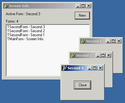 The FillFormsList method fills the list box and sets a value for the two labels above it to show the number of forms and the name of the active form. When you click the New button, the program creates an instance of the secondary form, gives it a new title, and displays it. The Forms list box is updated automatically because of the handler installed for the OnActiveFormChange event. Figure 8.2 shows the output of this program when some secondary windows have been created. Each secondary form has a Close button you can click to remove it. The program handles the OnClose event, setting the Action parameter to caFree, so that the form is destroyed when it is closed. This code closes the form, but it doesn't update the list of the windows properly. The system moves the focus to another window first, firing the event that updates the list, and destroys the old form only after this operation. The first idea I had to update the windows list properly was to introduce a delay, posting a user-defined Windows message. Because the posted message is queued and not handled immediately, if you send it at the last possible moment of the secondary form's life, the main form will receive it when the other form is destroyed. The trick is to post the message in the secondary form's OnDestroy event handler. To accomplish this, you need to refer to the MainForm object by adding a uses statement in the implementation portion of this unit. I've posted a wm_User message, which is handled by a specific message method of the main form, as shown here: public procedure ChildClosed (var Message: TMessage); message wm_User; procedure TMainForm.ChildClosed (var Message: TMessage); begin FillFormsList (Self); end; The problem is that if you close the main window before closing the secondary forms, the main form exists, but its code can no longer be executed. To avoid another system error (an Access Violation Fault), you need to post the message only if the main form is not closing. But how do you determine whether the form is closing? One way is to add a flag to the TMainForm class and change its value when the main form is closing, so that you can test the flag from the code of the secondary window. This is a good solution—so good that the VCL already provides similar functionality with the ComponentState property and its csDestroying flag, as mentioned earlier. Therefore, you can write the following code:
