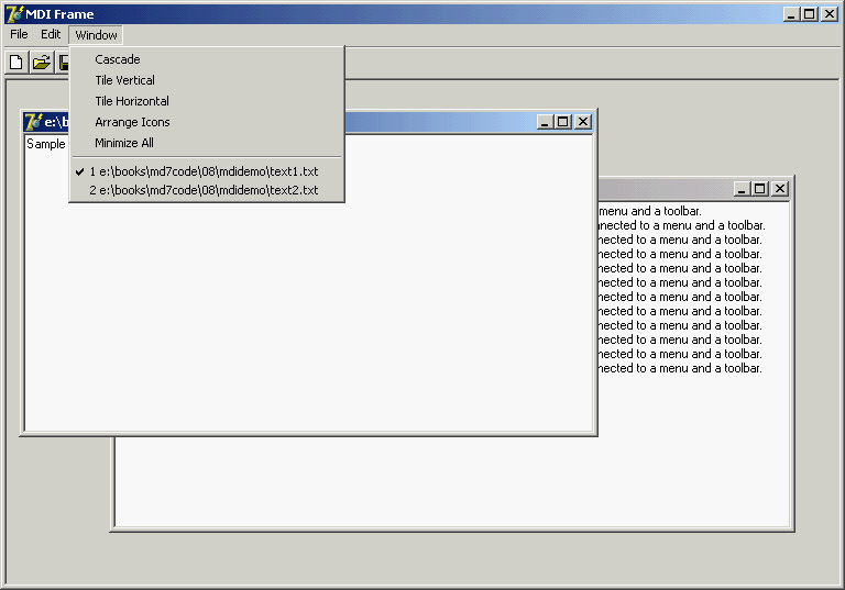 Frame and Child Windows in DelphiDelphi makes it easy to develop MDI applications, even without using the MDI Application template available in Delphi (see the Applications page of the File ® New ® Other dialog box). You only need to build at least two forms, one with the FormStyle property set to fsMDIForm and the other with the same property set to fsMDIChild. Set these two properties in a simple program and run it, and you'll see the two forms nested in the typical MDI style. Generally, however, the child form is not created at startup, and you need to provide a way to create one or more child windows. You can do so by adding a menu with a New menu item and writing the following code: var ChildForm: TChildForm; begin ChildForm := TChildForm.Create (Application); ChildForm.Show; Another important feature to add is a Window pull-down menu, which you use as the value of the form's WindowMenu property. This pull-down menu will automatically list all the available child windows. (Of course, you can choose any other name for the pull-down menu, but Window is the standard.) To make this program work properly, you can add a number to the title of any child window when it is created: procedure TMainForm.New1Click(Sender: TObject); var ChildForm: TChildForm; begin WindowMenu := Window1; Inc (Counter); ChildForm := TChildForm.Create (Self); ChildForm.Caption := ChildForm.Caption + ' ' + IntToStr (Counter); ChildForm.Show; end; You can also open child windows, minimize or maximize each of them, close them, and use the Window pull-down menu to navigate among them. Now suppose you want to close some of these child windows, to unclutter the client area of your program. Click the Close boxes in some of the child windows, and they are minimized! What is happening? Remember that when you close a window, you generally hide it from view. The closed forms in Delphi still exist, although they are not visible. In the case of child windows, hiding them won't work, because the MDI Window menu and the list of windows will still list existing child windows, even if they are hidden. For this reason, Delphi minimizes the MDI child windows when you try to close them. To solve this problem, you need to delete the child windows when they are closed by setting the Action reference parameter of the OnClose event to caFree. Building a Complete Window MenuYour first task is to define a better menu structure for the example. Typically the Window pull-down menu has at least three items: Cascade, Tile, and Arrange Icons. To handle the menu commands, you can use some of the predefined methods of TForm that can be used only for MDI frames:
