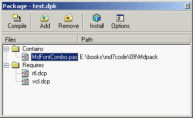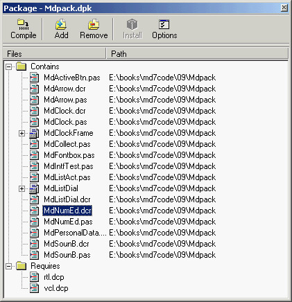 When the bitmap for the component is ready, you can install the component in Delphi by using the Package Editor's Install Package toolbar button. After this operation, the Contains section of the editor will list both the component's PAS file and the corresponding DCR file. In Figure 9.3, you can see all the files (including the DCR files) of the final version of the MdPack package. If the DCR installation doesn't work properly, you can manually add the {$R unitname.dcr} statement in the package source code. |
