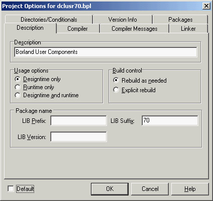 As you can see, Delphi uses specific language keywords for packages. The first is the package keyword (similar to the library keyword I'll discuss in the next chapter), which introduces a new package project. Then comes a list of all the compiler options, some of which I've omitted from the listing. Usually the options for a Delphi project are stored in a separate file; packages, by contrast, include all the compiler options directly in their source code. Among the compiler options is a DESCRIPTION compiler directive, used to make the package description available to the Delphi environment. After you've installed a new package, its description will appear in the Packages page of the Project Options dialog box, a page you can also activate by selecting the Component ® Install Packages menu item. This dialog box is shown in Figure 9.2. In addition to common directives like DESCRIPTION, there are other compiler directives specific to packages. The most common of these options are easily accessible through the Package Editor's Options button. After this list of options come the requires and contains keywords, which list the items displayed visually in the two pages of the Package Editor. Again, requires lists the packages required by the current package, and contains lists the units installed by this package. Let's consider the technical effect of building a package. Besides the DPK file with the source code, Delphi generates a BPL file with the dynamic link version of the package and a DCP file with the symbol information. In practice, this DCP file is the sum of the symbol information for the DCU files of the units contained in the package. At design time, Delphi requires both the BPL and DCP files, because the BPL file has the code of the components created on the design form and the symbol information required by the code insight technology. If you link the package dynamically (using it as a run-time package), the DCP file will also be used by the linker, and the BPL file should be shipped along with the application's main executable file. If you instead link the package statically, the linker refers to the DCU files, and you'll need to distribute only the final executable file. For this reason, as a component designer, you should generally distribute at least the BPL file, the DCP file, and the DCU files of the units contained in the package and any corresponding DFM files, plus a Help file. As an option, of course, you can also make available the source code files of the package units (the PAS files) and of the package itself (the DPK file).