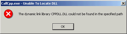 To use this C++ DLL, I've built a Delphi example named CallCpp. Its form has only the buttons used to call the functions of the DLL and some visual components for input and output parameters (see Figure 10.1). Notice that to run this application, you should have the DLL in the same directory as the project, in one of the directories on the path, or in the Windows main folder (\Windows, \WinNT…) or the Windows' system folder (\Windows\System, \WinNT\System32…). If you move the executable file to a new directory and try to run it, you'll get a run-time error indicating that the DLL is missing: |