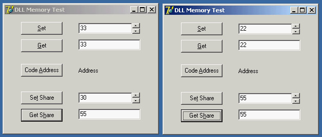 This is the case for the DLL code, but what about the global data? Basically, each copy of the DLL has its own copy of the data, in the address space of the calling application. However, it is possible to share global data between applications using a DLL. The most common technique for sharing data is to use memory-mapped files. I'll use this technique for a DLL, but it can also be used to share data directly among applications. This example is called DllMem for the library and UseMem for the demo application. The DLL code has a project file that exports four subroutines: library dllmem; uses SysUtils, DllMemU in 'DllMemU.pas'; exports SetData, GetData, GetShareData, SetShareData; end. The actual code is in the secondary unit (DllMemU.PAS), which contains the code for the four routines that read or write two global memory locations. These memory locations hold an integer and a pointer to an integer. Here are the variable declarations and the two Set routines: var PlainData: Integer = 0; // not shared ShareData: ^Integer; // shared procedure SetData (I: Integer); stdcall; begin PlainData := I; end; procedure SetShareData (I: Integer); stdcall; begin ShareData^ := I; end; Sharing Data with Memory-Mapped FilesFor the data that isn't shared, there isn't anything else to do. To access the shared data, however, the DLL has to create a memory-mapped file and then get a pointer to this memory area. These operations require two Windows API calls: