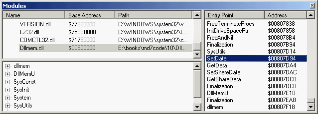 This code displays, in a label, the memory address of the function, within the address space of the calling application. If you run two programs using this code, they'll generally both show the same address. This technique demonstrates that the code is loaded only once at a common memory address. Another technique to get more information about what's going on is to use Delphi's Modules window, which shows the base address of each library referenced by the module and the address of each function within the library, as shown here: It's important to know that the base address of a DLL is something you can request by setting the base address option. In Delphi this address is determined by the Image Base value in the linker page of the Project Options dialog box. In the DllMem library, for example, I've set it to $00800000. You need to have a different value for each of your libraries, verifying that it doesn't clash with any system library or other library (package, ActiveX, and so on) used by the executable. Again, this is something you can figure out using the Module window of the debugger. Although this doesn't guarantee a unique placement, setting a base address for the library is always better than not setting one; in this case a relocation always takes place, but the chance that two different executables will relocate the same library at the same address are not high.