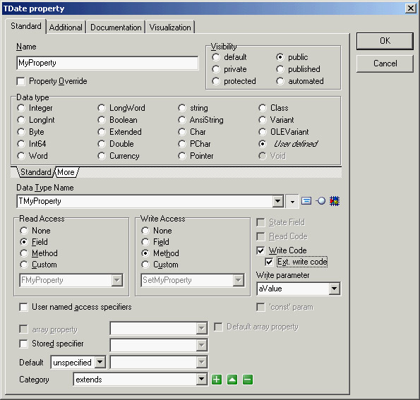 Coding Features of ModelMakerAs you've seen, ModelMaker is a powerful UML diagramming tool, and you can do a great deal of analysis and design work exercising only those capabilities; but, as I'll explain in the following sections, ModelMaker offers a great deal more than just diagramming. Many developers use ModelMaker as their primary development environment, supplanting Delphi in that regard. This is due in part to the visual way in which ModelMaker represents Delphi programming tasks, automating many of the repetitive parts of coding Delphi classes. But it is also because Delphi, for all its strengths, tends to facilitate the development of code where the line between the presentation domain and problem domain is blurred. In other words, it is easy to write application implementation code—the code that actually does stuff—and put it right in the event handlers of your forms. This is typically not considered good object-oriented design. On the other hand, ModelMaker facilitates the creation and refactoring of problem domain objects, and the de-coupling of those objects from the user interface. Before we get to these topics, though, I'll first discuss how Delphi and ModelMaker work together. Delphi/ModelMaker IntegrationWhen properly installed, ModelMaker adds a menu to the Delphi IDE, appropriately labeled ModelMaker: ![]() If you don't see this menu, you need to install ModelMaker's DLL-based wizard in the Delphi registry, as covered in the sidebar "Installing New DLL Wizards" at the end of Chapter 1. From this menu, you can control ModelMaker somewhat and quickly import your code into ModelMaker projects. Most of the menu options are available only if ModelMaker is running. Once you start ModelMaker (either from the Run ModelMaker menu item or in the normal fashion), the other items will become available. The integration menu contains a number of ways to add your code to a model. The Add to Model, Add Files to Model, Convert to Model, and Convert Project to Model items cause ModelMaker to import the specified units: The Add items import units into the currently loaded model in ModelMaker, and the Convert items create a new model and import the units into it. Convert Project to Model is a great place to begin—make sure you back up your code, and then select this menu item while one of your projects is open in Delphi. The entire project will be imported into a new model in ModelMaker. Also in the integration menu is Refresh in Model, which forces ModelMaker to re-import the current unit. This is a good time to discuss one of the consequences of ModelMaker's internal code model that I mentioned earlier. Because ModelMaker operates on its internal model and not on your external source code files (until you regenerate the files), it is common to find that both your model and your source code files have been edited—the result being that your model is now out of synch with the source files. When the source files have changed but not the model, you can re-synch the model by re-importing the source units. But if both the model and source files have been changed, the situation is more complicated. Fortunately, ModelMaker offers a robust set of tools to handle synchronization problems. See the section "The Difference View" for more information. Another item of note in the integration menu is Jump to ModelMaker. When you select this item, ModelMaker attempts to find the current code position within its loaded model, bringing ModelMaker to the front in the process. Although ModelMaker can be controlled from Delphi, the integration is two-way. Similar to the ModelMaker menu in the Delphi IDE, a Delphi menu appears in ModelMaker. In that menu are commands that let you jump from the currently selected model element to its corresponding position in the source code file in Delphi, as well as commands that cause Delphi to perform a syntax check, a compile, or a build. Thus you can edit your code, generate it, and compile it, all from within ModelMaker. Managing the Code ModelIt's time to discuss the nuts and bolts of coding within ModelMaker. Due to the objectified nature of ModelMaker's internal code model, editing code model elements is typically a more visual process than it is in Delphi. Editing a class property, for instance, is done via the Property Editor dialog, as you can see in Figure 11.6. Here is one of the best examples of ModelMaker's automation. When you add a new property, you don't have to worry about all the overhead of also adding a private state field, any read or write methods, or even the property's declaration. All you do is choose the appropriate settings in the editor, and ModelMaker creates the necessary supporting class members. This is more extended than the similar benefits offered in the Delphi IDE by Class Completion. Notice that the attributes of a property that you might normally type in by hand are represented by various controls in the dialog. Visibility, Type, Read and Write specifications, and so on are all managed in the editor. The benefits are in the area of refactoring (not to mention the elimination of certain repetitive typing tasks). For instance, because ModelMaker manages a property as an object in its code model, changing something about the property—its type, for instance—will cause ModelMaker to apply that change to any references of which it is aware. If later you want to change the read access from a field to a method, you can make that change in the editor, and ModelMaker will take care of adding the get method and changing the property's declaration. Best of all, if you decide to rename the property or move it to another class, the property owns its supporting class members: They will be automatically renamed or moved as appropriate. The same approach is used for each of the class member types; similar editors exist for methods, events, fields, and even method resolution clauses. There's a developer-level sense of abstraction to developi