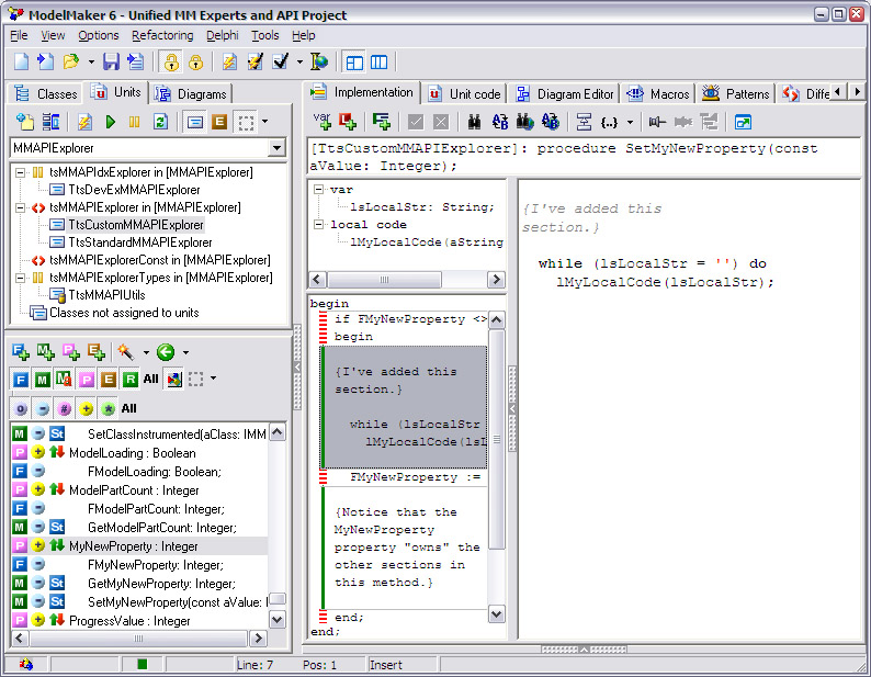 In this example, ModelMaker will emit the type declaration just as you've entered it—as plain text—and then begin expanding the TDateForm class declaration. ModelMaker offers tools within the Unit Code Editor for managing unit-level methods, and they are a significant convenience when you have large routine library-type units. However, now that you're using ModelMaker, you can leverage its strong refactoring features to objectify some of those routines. The Method Implementation Code EditorModelMaker's Method Implementation Code Editor (see Figure 11.7) is quite different from the Unit Code Editor. The editor takes up the right two thirds of the screen. In this example, I've added a fictional property named MyNewProperty and allowed ModelMaker to generate the state field and the read and write access methods. The write access method is active in the editor. Next to the code editor on the right you can see two interesting windows. The tree view on top is the local code explorer: Here you can manage local variables and local procedures. Below that is the Section List; ModelMaker allows you to break up code within a method implementation into sections. In part, this is an organizational convenience; but more importantly, it allows ModelMaker to control specific sections of code. Just as ModelMaker can own parts of the model (like a property access method automatically generated for a property), it can also own sections of code within a method. Most often this occurs when you have chosen to have ModelMaker generate the read or write code within a property access method. Notice that in this example, the first, third, and fifth sections have a red and white dashed left margin, indicating that they are owned by ModelMaker. The sections with the green margin are user-owned. When ModelMaker generates this method, the code will be emitted in the order shown, one section after another.