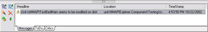 The Difference ViewAs I mentioned earlier, it's easy to get into a situation where your model is out of synch with your source files. If both your model and your source files have been edited, you can't simply regenerate the files from the model, lest you overwrite the source file changes. Likewise, you can't re-import the units, for fear of eliminating the changes to the model. Fortunately, ModelMaker offers one of the most robust differencing tools I've seen. When you find your model out of synch, it's time to visit the Difference tab (see Figure 11.8). ModelMaker offers a variety of ways to view differences. You can view a standard text file comparison, time stamp differences, or even a comparison of two selected classes within the model. My favorite is on display in Figure 11.8—a structured difference. ModelMaker temporarily imports the source file on disk (thereby objectifying it just like the internal code model) and compares the imported file with the same unit and classes in the model on an object and attribute level rather than as text. The result is a much faster, much more accurate comparison. Notice in the tree view in Figure 11.8 the icons that denote differences. The red <> indicates that both the model and the source file contain the indicated class member (btnUITestClick in the example) but the two instances differ. The differing code is displayed in the memo controls to the right. The green + in the tree view indicates that the indicated class member exists only in the model, not on the disk. The blue – indicates that the class member exists only on disk, not in the model. With this information, you can choose how to proceed in re-synchronizing your model. One nifty feature is the ability to re-import a selected method (rather than the whole unit) from within the Difference view. This approach implies that it is very important to know when your model is out of synch, so you don't override your changes on disk when regenerating the source files. Fortunately, ModelMaker offers several safeguards that can prevent this situation. One of these is a Design Critic (see the "Little-Known Tidbits" section later in the chapter). If your Design Critics are enabled, ModelMaker's Message View will warn you when a file on disk has changed: The Event Types ViewModelMaker enables the management of event types on the Events tab; there you can edit event type declarations. But keep in mind that although a new event type may exist in ModelMaker's internal code model, it does not exist in a source file until you add the event type's declaration to a unit. The easiest way to manage that process is to drag the event type declaration from the Events view list to the Unit list and drop the item into a unit. |
