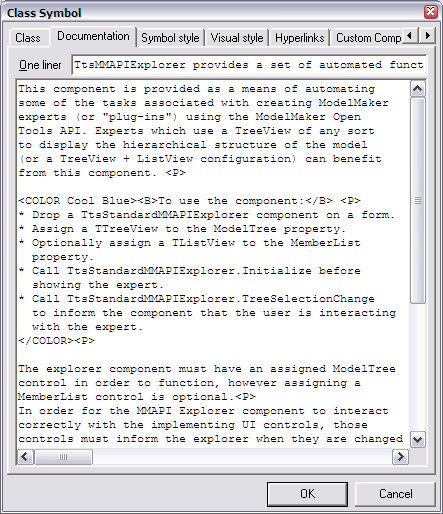 Documentation and MacrosModelMaker can come in very handy in supporting software documentation efforts. You need to master an important concept prior to proceeding (fortunately, it is not complex): Within ModelMaker, documentation does not equate to comments. Fear not; you can do complicated things with source code commenting, but you must take some steps to cause ModelMaker to emit (or import) those comments. Virtually every model element (classes, units, members, diagram symbols, and so on) can have documentation, but entering documentation for an element will not automatically cause that documentation to appear in your source code. That text is attached to the element within the model, but you must cause ModelMaker to generate a source code comment that contains your documentation. Documentation versus CommentsEvery element in a ModelMaker code model can own two types of documentation: a standard, large text block of documentation, and a short one liner (see Figure 11.9). These texts can serve multiple purposes within the context of ModelMaker and, as noted earlier, do not directly equate to source code comments, although such comments can be generated from them. In this example, a class has both types of documentation. This documentation might appear in a diagram as an attached annotation (either the one liner or the standard documentation can be used), or you can specify that either or both be used as part of the source code file's comments. To do this, you'll need to use ModelMaker's powerful macros (discussed in the next section) and change some of your project options. For now, let's not worry about the macros (accepting the defaults) and look only at the project options. Access the Project Options dialog by selecting Project Options from the Options menu and select the Source Doc Generation tab. Here you will find many options regarding the generation of source code comments from ModelMaker documentation. (For more information, see the online ModelMaker help.) To see source code commenting in action, select Before Declaration from the Method Implementation section of the In Source Documentation Generation group. Now any methods that contain documentation will use the default macro to generate source code comments. ModelMaker can also import comments from a source unit and associate those comments with the appropriate code model elements. To do this, you must signify your comments with a Documentation Import Signature (see the Source Doc Import tab of the Project Options dialog) and tell ModelMaker what lines to import into the model. Thus if your method implementation has comments like the following, you can tell ModelMaker to ignore the first five lines and import only the actual comment text: