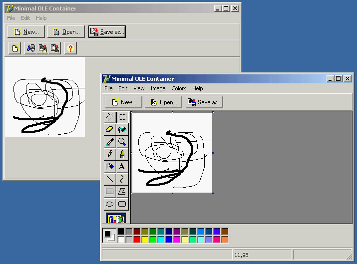 Figure 12.6: The second toolbar of the OleCont example (above) is replaced by the server's toolbar (below).