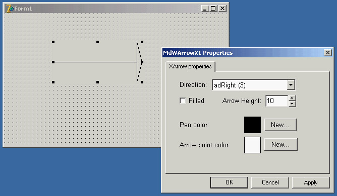 In the property page, you can add controls as in a normal Delphi form, and you can write code to let the controls interact. In the XArrow example, I've added to the property page a combo box with the possible values of the Direction property, a check box for the Filled property, an edit box with an UpDown control to set the ArrowHeight property, and two shapes with corresponding buttons for the colors. You can see this form in the Delphi IDE while working on the ActiveX control in Figure 12.9. The only code added to the form relates to the two buttons used to change the color of the two shape components, which offer a preview of the ActiveX control's color. The button's OnClick event uses a ColorDialog component, as usual: