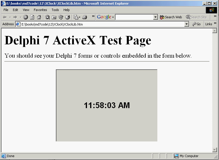 Notice the effect of the sunken border. This is controlled by the active form's AxBorderStyle property, one of the few properties of active forms that is not available for a plain form. ActiveX in Web PagesIn the previous example, you used Delphi's ActiveForm technology to create a new ActiveX control. An ActiveForm is an ActiveX control based on a form. Borland documentation often implies that ActiveForms should be used in HTML pages, but you can use any ActiveX control on a web page. Basically, each time you create an ActiveX library, Delphi should enable the Project ® Web Deployment Options and Project ® Web Deploy menu items.