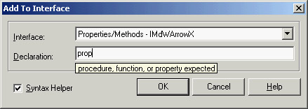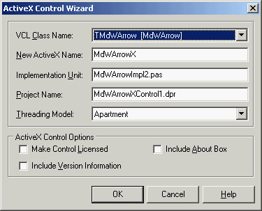 In either case, you can optionally prepare a property page for the control, to use as a sort of property editor for setting the initial value of the control's properties in any development environment—an alternative to the Object Inspector in Delphi. Because most development environments allow only limited editing, it is more important to write a property page than it is to write a component or property editor for a Delphi control. Building an ActiveX ArrowAs an example of the development of an ActiveX control, I've decided to take the Arrow component from Chapter 9, "Writing Delphi Components," and turn it into an ActiveX control. You cannot use that component directly, because it is a graphical control (a subclass of TGraphicControl). However, turning a graphical control into a window-based control is usually a straightforward operation. In this case, you change the base class name to TCustomControl (and change the name of the control's class to TMdWArrow, as well, to avoid a name clash), as you can see in the source code files in the XArrow folder. After installing this component in Delphi, you are ready to begin developing the new example. To create a new ActiveX library, select File ® New ® Other, move to the ActiveX page, and choose ActiveX library. Delphi creates the bare skeleton of a DLL, as you saw at the beginning of this chapter. I've saved this library as XArrow, in a directory with the same name, as usual. Now it is time to use the ActiveX Control Wizard, available in the ActiveX page of the Object Repository—Delphi's New dialog box: In this wizard, you select the VCL class you are interested in, customize the names shown in the edit boxes, and click OK; Delphi then builds the complete source code of an ActiveX control for you. The use of the three check boxes at the bottom of the ActiveX Control Wizard window may not be obvious. If you make the control licensed, Delphi will include a license key in the code and provide this same GUID in a separate .LIC file. This license file is necessary to use the control in a design environment without the proper license key for the control or use it within a web page. The second check box allows you to include version information for the ActiveX control in the OCX file. If the third check box is selected, the ActiveX Control Wizard automatically adds an About box to the control. Look at the code the ActiveX Control Wizard generates. This wizard's key element is the generation of a type library and, of course, a corresponding type library import unit with the definition of an interface (dispinterface) and other types and constants. In this example, the import file is named XArrow_TLB.PAS: I suggest you study it to understand how Delphi defines an ActiveX control. The unit includes a GUID for the control, constants for the definition of values corresponding to the COM enumerated types used by properties of the Delphi control (like TxMdWArrowDir), and the declaration of the IMdWArrowX interface. The final part of the import unit includes the declaration of the TMdWArrowX class. This is a TOleControl-derived class you can use to install the control in Delphi, as you saw in the first part of this chapter. You don't need this class to build the ActiveX control; you need it to install the ActiveX control in Delphi. The rest of the code, and the code you'll customize, is in the main unit, which in the XArrow example is called MdWArrowImpl1. This unit has the declaration of the ActiveX server object, TMdWArrowX, which inherits from TActiveXControl and implements the specific IMdWArrowX interface. Before you customize this control, let's see how it works. Compile the ActiveX library and then register it using Delphi's Run ® Register ActiveX Server menu command. Now you can install the ActiveX control as you've done in the past, except you have to specify a different name for the new class to avoid a name clash. If you use this control, it doesn't look much different from the original VCL control, but the same component can now be installed in other development environments. Adding New PropertiesOnce you've created an ActiveX control, adding new properties, events, or methods to it is—surprisingly—simpler than doing the same operation for a VCL component. Delphi, provides specific visual support for adding properties, methods, or events to an ActiveX control, but not for a VCL control. You can open the Delphi unit with the implementation of the ActiveX control, and choose Edit ® Add To Interface. As an alternative, you can use the same command from the editor's shortcut menu. Delphi opens the Add To Interface dialog box: In the combo box, you can choose between a new property, method, or event. In the edit box, you can then type the declaration of this new interface element. If the Syntax Helper check box is activated, you'll get hints describing what you should type next and highlighting any errors. When you define a new ActiveX interface element, keep in mind that you are restricted to COM data types. In the XArrow example, I've added two properties to the ActiveX control. Because the Pen and Brush properties of the original Delphi components are not accessible, I've made their color available. These are examples of what you can write in the Add To Interface dialog box's edit box (executing it twice): property FillColor: Integer; property PenColor: Integer;