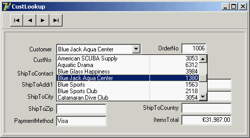 The program has some code to fill in the table with random values. This code is tedious and not too complex, so I won't discuss the details here, but you can look at the DbAware source code if you are interested. Using Lookup ControlsIf the list of values is extracted from another dataset, then instead of the DBListBox and DBComboBox controls you should use the specific DBLookupListBox or DBLookupComboBox component. These components are used every time you want to select for a field a value that corresponds to a record of another dataset (and not to choose a different record to display!). For example, if you build a standard form for taking orders, the orders dataset will generally have a field hosting a number indicating the customer who made the order. Working directly with the customer number is not the most natural way; most users will prefer to work with customer names. However, in the database, the customers' names are stored in a different table, to avoid duplicating the customer data for each order by the same customer. To get around such a situation, with local databases or small lookup tables, you can use a DBLookupComboBox control. (This technique doesn't port well to client/server architecture with large lookup tables, as discussed in the next chapter.) The DBLookupComboBox component can be connected to two data sources at the same time: one source containing the data and a second containing the display data. I built a standard form using the orders.cds file from the Delphi sample data folder; the form includes several DBEdit controls. You should remove the standard DBEdit component connected to the customer number and replace it with a DBLookupComboBox component (and a DBText component, to fully understand what is going on). The lookup component (and the DBText) is connected to the DataSource for the order and to the CustNo field. To let the lookup component show the information extracted from another file (customer.cds) you need to add another ClientDataSet component referring to the file, along with a new data source. For the program to work, you need to set several properties of the DBLookupComboBox1 component. Here is a list of the relevant values: object DBLookupComboBox1: TDBLookupComboBox DataField = 'CustNo' DataSource = DataSourceOrders KeyField = 'CustNo' ListField = 'Company;CustNo' ListSource = DataSourceCustomer DropDownWidth = 300 end The first two properties determine the main connection, as usual. The next four properties determine the field used for the join (KeyField), the information to display (ListField), and the secondary source (ListSource). In addition to entering the name of a single field, you can provide multiple fields, as I did in the example. Only the first field is displayed as combo box text, but if you set a large value for the DropDownWidth property, the combo box's drop-down list will include multiple columns of data. You can see this output in Figure 13.4.