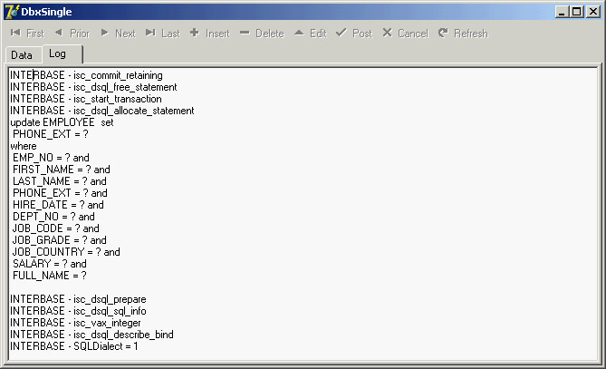 As I mentioned earlier, the picture can be simplified by using the SimpleDataSet component, which replaces the two datasets and the provider (and possibly even the connection). The SimpleDataSet component combines most of the properties of the components it replaces. Using a Single Component or Many ComponentsFor this first example, drop a SimpleDataSet component on a form and set the connection name of its Connection subcomponent. Set the CommandType and CommandText properties to specify which data to fetch, and set the PacketRecords property to indicate how many records to retrieve in each block. These are the key properties of the component in the DbxSingle example: object SimpleDataSet1: TSimpleDataSet Connection.ConnectionName = 'IBLocal' Connection.LoginPrompt = False DataSet.CommandText = 'EMPLOYEE' DataSet.CommandType = ctTable end As an alternative, the DbxMulti example uses the entire sequence of components: object SQLConnection1: TSQLConnection ConnectionName = 'IBLocal' LoginPrompt = False end object SQLDataSet1: TSQLDataSet SQLConnection = SQLConnection1 CommandText = 'select * from EMPLOYEE' end object DataSetProvider1: TDataSetProvider DataSet = SQLDataSet1 end object ClientDataSet1: TClientDataSet ProviderName = 'DataSetProvider1' end object DataSource1: TDataSource DataSet = ClientDataSet1 end Both examples include some visual controls: a grid and a toolbar based on the action manager architecture. Applying UpdatesIn every example based on a local cache, like the one provided by the ClientDataSet and SimpleDataSet components, it's important to write the local changes back to the database server. This is typically accomplished by calling the ApplyUpdates method. You can either keep the changes in the local cache for a while and then apply multiple updates at once, or you can post each change right away. In these two examples, I've gone for the latter approach, attaching the following event handler to the AfterPost (fired after an edit or an insert operation) and AfterDelete events of the ClientDataSet components: procedure TForm1.DoUpdate(DataSet: TDataSet); begin // immediately apply local changes to the database SQLClientDataSet1.ApplyUpdates(0); end; If you want to apply all the updates in a single batch, you can do so either when the form is closed or when the program ends, or you can let a user perform the update operation by selecting a specific command, possibly using the corresponding predefined action provided by Delphi 7. We'll explore this approach when discussing the update caching support of the ClientDataSet component in more detail later in this chapter. Monitoring the ConnectionAnother feature I've added to the DbxSingle and DbxMulti examples is the monitoring capability offered by the SQLMonitor component. In the example, the component is activated as the program starts. In the DbxSingle example, because the SimpleDataSet embeds the connection, the monitor cannot be hooked to it at design time, but only when the program starts: procedure TForm1.FormCreate(Sender: TObject); begin SQLMonitor1.SQLConnection := SimpleDataSet1.Connection; SQLMonitor1.Active := True; SimpleDataSet1.Active := True; end; Every time a tracing string is available, the component fires the OnTrace event to let you choose whether to include the string in the log. If the LogTrace parameter of this event is True (the default value), the component logs the message in the TraceList string list and fires the OnLogTrace event to indicate that a new string has been added to the log. The component can also automatically store the log into the file indicated by its FileName property, but I haven't used this feature in the example. All I've done is handle the OnTrace event, copying the entire log in the memo with the following code (producing the output shown in Figure 14.6): procedure TForm1.SQLMonitor1Trace(Sender: TObject; CBInfo: pSQLTRACEDesc; var LogTrace: Boolean); begin Memo1.Lines := SQLMonitor1.TraceList; end; Controlling the SQL Update CodeIf you run the DbxSingle program and change, for example, an employee's telephone number, the monitor will log this update operation: update EMPLOYEE set PHONE_EXT = ? where EMP_NO = ? and FIRST_NAME = ? and LAST_NAME = ? and PHONE_EXT = ? and HIRE_DATE = ? and DEPT_NO = ? and JOB_CODE = ? and JOB_GRADE = ? and JOB_COUNTRY = ? and SALARY = ? and FULL_NAME = ? By setting the SimpleDataSet's properties there is no way to change how the update code is generated (which happens to be worse than with the SQLClientDataSet component, which had the UpdateMode you could use to tweak the update statements). In the DbxMulti example, you can use the UpdateMode property of the DataSetProvider component, setting the value to upWhereChanged or upWhereKeyOnly. In this case you'll get the following two statements, respectively: update EMPLOYEE set PHONE_EXT = ? where EMP_NO = ? and PHONE_EXT = ? update EMPLOYEE set PHONE_EXT = ? where EMP_NO = ?