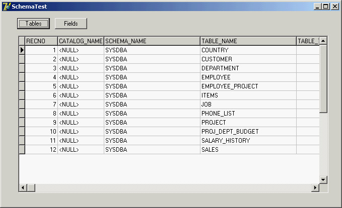 For example, in the SchemaTest program, a Tables button reads into the dataset all of the connected database's tables: ClientDataSet1.Close; SQLDataSet1.SetSchemaInfo (stTables, '', ''); ClientDataSet1.Open; The program uses the usual group of dataset provider, client dataset, and data source component to display the resulting data in a grid, as you can see in Figure 14.7. After you're retrieved the tables, you can select a row in the grid and click the Fields button to see a list of the fields of this table: