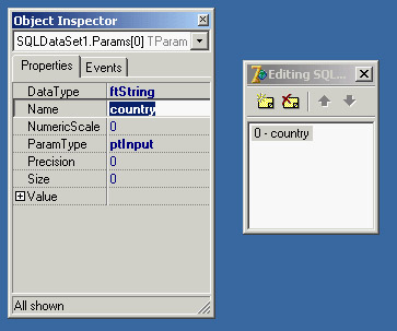 A Parametric QueryWhen you need slightly different versions of the same SQL query, instead of modifying the text of the query itself each time, you can write a query with a parameter and change the value of the parameter. For example, if you decide to have a user choose the employees in a given country (using the employee table), you can write the following parametric query: select * from employee where job_country = :country In this SQL clause, :country is a parameter. You can set its data type and startup value using the editor of the SQLDataSet component's Params property collection. When the Params collection editor is open, as shown in Figure 14.8, you see a list of the parameters defined in the SQL statement; you can set the data type and the initial value of these parameters in the Object Inspector. The form displayed by this program, called ParQuery, uses a combo box to provide all the available values for the parameters. Instead of preparing the combo box items at design time, you can extract the available contents from the same database table as the program starts. This is accomplished using a second query component, with this SQL statement: select distinct job_country from employee After activating this query, the program scans its result set, extracting all the values and adding them to the list box: