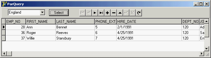The user can select a different item in the combo box and then click the Select button (Button1) to change the parameter and activate (or re-activate) the query: procedure TQueryForm.Button1Click(Sender: TObject); begin SqlDataSet1.Close; ClientDataSet1.Close; Query1.Params[0].Value := ListBox1.Items [Listbox1.ItemIndex]; SqlDataSet1.Open; ClientDataSet1.Open; end; This code displays the employees from the selected country in the DBGrid, as you can see in Figure 14.9. As an alternative to using the elements of the Params array by position, you should consider using the ParamByName method, to avoid any problem in case the query gets modified over time and the parameters end up in a different order. By using parametric queries, you can usually reduce the amount of data moved over the wire from the server to the client and still use a DBGrid and the standard user interface common in local database applications.