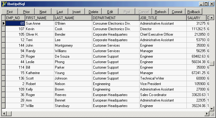 Another feature of this example is the presence of a transaction component. As I've said, the InterBase Express components make the use of a transaction component compulsory, explicitly following a requirement of InterBase. Simply adding a couple of buttons to the form to commit or roll back the transaction would be enough, because a transaction starts automatically as you edit any dataset attached to it. I've also improved the program by adding an ActionList component. This component includes all the standard database actions and adds two custom actions for transaction support: Commit and Rollback. Both actions are enabled when the transaction is active: procedure TForm1.ActionUpdateTransactions(Sender: TObject); begin acCommit.Enabled := IBTransaction1.InTransaction; acRollback.Enabled := acCommit.Enabled; end; When executed, they perform the main operation but also need to reopen the dataset in a new transaction (which can also be done by "retaining" the transaction context). CommitRetaining doesn't really reopen a new transaction, but it allows the current transaction to remain open. This way, you can keep using your datasets, which won't be refreshed (so you won't see edits already committed by other users) but will keep showing the data you've modified. Here is the code: procedure TForm1.acCommitExecute(Sender: TObject); begin IBTransaction1.CommitRetaining; end; procedure TForm1.acRollbackExecute(Sender: TObject); begin IBTransaction1.Rollback; // reopen the dataset in a new transaction IBTransaction1.StartTransaction; EmpDS.DataSet.Open; end;