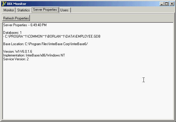 If you run the two examples at the same time, the output of the IbxMon program will list details about the IbxUpdSql program's interaction with InterBase, as you can see in Figure 14.15. Getting More System DataIn addition to letting you monitor the InterBase connection, the IbxMon example allows you to query some server settings using the various tabs on its page control. The example embeds a few IBX administrative components, showing server statistics, server properties, and all connected users. You can see an example of the server properties in Figure 14.16. The code for extracting the users appears in the following code fragment.