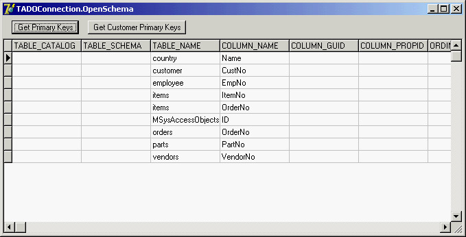 Getting Schema InformationIn ADO, you can retrieve schema information using the ADOConnection component's OpenSchema method. This method accepts four parameters: