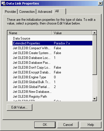 There are two Jet OLE DB providers: the Jet 3.51 OLE DB provider and the Jet 4.0 OLE DB provider. The Jet 3.51 OLE DB provider uses the Jet 3.51 engine and supports Access 97 databases only. If you intend to use Access 97 and not Access 2000, then you will get better performance using this OLE DB provider in most situations than using the Jet 4.0 OLE DB provider. The Jet 4.0 OLE DB provider supports Access 97, Access 2000, and Installable Indexed Sequential Access Method (IISAM) drivers. Installable ISAM drivers are those written specifically for the Jet engine to support access to ISAM formats such as Paradox, dBase, and text, and it is this facility that makes the Jet engine so useful and versatile. The complete list of ISAM drivers installed on your machine depends on what software you have installed. You can find this list by looking in the Registry at HKEY_LOCAL_MACHINE\Software\Microsoft\Jet\4.0\ISAM Formats However, the Jet engine includes drivers for Paradox, dBase, Excel, text, and HTML. Paradox through JetThe Jet engine expects to be used with Access databases. To use it with any database other than Access, you need to tell it which IISAM driver to use. This is a painless process that involves setting the Extended Properties connection string argument in the connection string editor. Let's work through a quick example. Add an ADOTable component to a form and invoke the connection string editor. Select the Jet 4.0 OLE DB Provider. Select the All page, locate the Extended Properties property, and double-click it to edit its value. Enter Paradox 7.x in the Property Value, as illustrated in Figure 15.4, and click OK. Now go back to the Connection tab and enter the name of the directory containing the Paradox tables directly, because the Browse button won't help you (it lets you enter a filename, not a folder name). At this point you can select a table in the ADOTable's TableName and open it either at design time or at run time. You are now using Paradox through ADO, as demonstrated by the JetParadox example. I have some bad news for Paradox users: Under certain circumstances, you will need to install the BDE in addition to the Jet engine. Jet 4.0 requires the BDE in order to be able to update Paradox tables, but it doesn't require the BDE just to read them. The same is true for most releases of the Paradox ODBC Driver. Microsoft has received justified criticism about this point and has made a new Paradox IISAM available that does not require the BDE; you can get these updated drivers from Microsoft Technical Support.