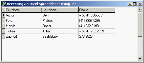 Excel through JetExcel is easily accessed using the Jet OLE DB provider. Once again, you set the Extended Properties property to Excel 8.0. Assume that you have an Excel spreadsheet called ABCCompany.xls with a sheet called Employees, and you want to open and read this file using Delphi. With a little knowledge of COM, you can do so by automating Excel. However, the ADO solution is considerably easier to implement and doesn't require Excel to be available on the computer.