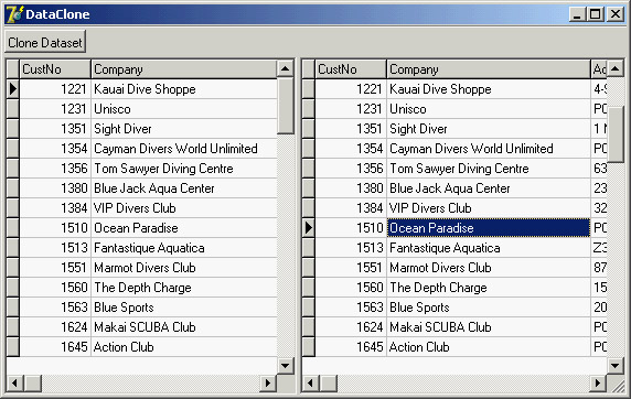 Figure 15.6: The form of the DataClone example, with two copies of a dataset (the original and a clone) This line clones ADOTable1 and assigns the clone to ADOTable2. In the program, you'll see a second view of the data. The two datasets have their own record pointers and other status information, so the clone does not interfere with its original copy. This behavior makes clones ideal for operating on a dataset without affecting the original data. Another interesting feature is that you can have multiple different active records, one for each of the clones— functionality you cannot achieve in Delphi with a single dataset.