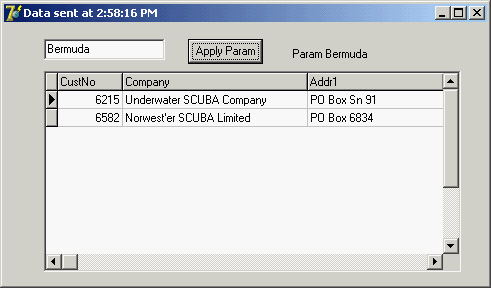 Besides the features discussed in the following sections, the AppSPlus and ThinPlus examples demonstrate the use of a socket connection, limited logging of events and updates on the server side, and direct fetching of a record on the client side. The last feature is accomplished with this call: procedure TClientForm.ButtonFetchClick(Sender: TObject); begin ButtonFetch.Caption := IntToStr (cds.GetNextPacket); end; This allows you to get more records than are required by the client user interface (the DBGrid). In other words, you can fetch records directly, without waiting for the user to scroll down in the grid. I suggest you study the details of these complex examples after reading the rest of this section. Parametric QueriesIf you want to use parameters in a query or stored procedure, then instead of building a custom solution (with a custom method call to the server), you can let Delphi help you. First define the query on the middle tier with a parameter: select * from customer where Country = :Country Use the Params property to set the type and default value of the parameter. On the client side, you can use the Fetch Params command from the ClientDataSet's shortcut menu, after connecting the component to the proper provider. At run time, you can call the equivalent FetchParams method of the ClientDataSet component. Now you can provide a local default value for the parameter by acting on the Params property. The value of the parameter will be sent to the middle tier when you fetch the data. The ThinPlus example refreshes the parameter with the following code: procedure TFormQuery.btnParamClick(Sender: TObject); begin cdsQuery.Close; cdsQuery.Params[0].AsString := EditParam.Text; cdsQuery.Open; end; You can see the secondary form of this example, which shows the result of the parametric query in a grid, in Figure 16.5. The figure also shows some custom data sent by the server, as explained in the section "Customizing the Data Packets." Custom Method CallsBecause the server has a normal COM interface, you can add more methods or properties to it and call them from the client. Simply open the server's type library editor and use it as with any other COM server. In the AppSPlus example, I've added a custom Login method with the following implementation:
